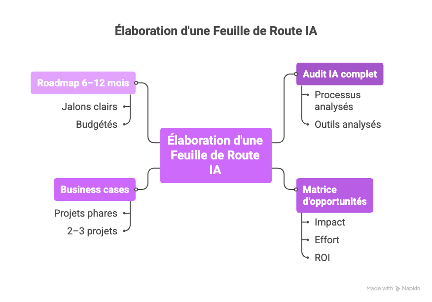 Vous obtenez une feuille de route IA claire, chiffrée et actionnable pour gagner du temps, réduire vos coûts et créer de nouveaux revenus — sans vous perdre dans la complexité.